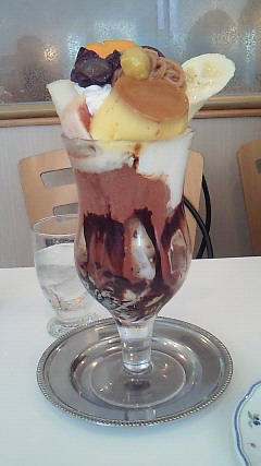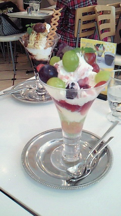 一人で調子乗って食べたのは、2人分くらいあると思われる「デラックスマロンパフェ」です(*^□^*)1800円くらい。秋限定かな。写真でお冷やのグラスと比べていただければ、大きさがお分かりかと思います。マロンクリームがすごく美味しかったvお腹いっぱいになってきたころに、底からコーヒーゼリーが出てくるのは苦しかったけど。4、5人分のカラフルな巨大パフェもあるので、どなたか挑戦してみてはいかがでしょうか。