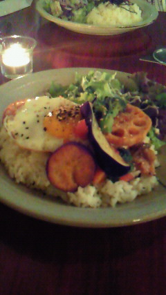 写真は「ゴロゴロ野菜とエスニックチキンのご飯プレート」みたいな名前だったと思います。どのお料理も一工夫あって、メニューを眺めているだけでときめいちゃいました♪