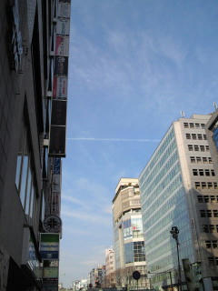 真横な飛行機雲。ツインタワーを綱渡りする人の映画を思い出した。