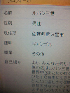 ルパンのマイミクになってみた。今日は古伊万里でも盗んでるのかしら。現住所は日によって変わるらしい。