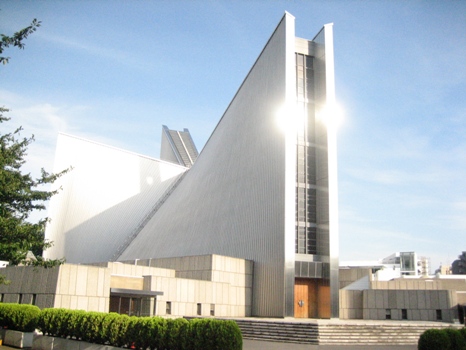 「東京カテドラル聖マリア大聖堂」にも行ってみました。都庁を設計した丹下健三の設計で、建物を上空から見ると十字架の形になっているそう。