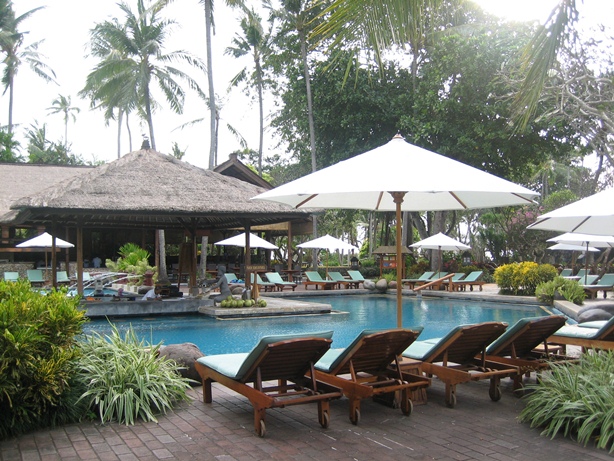 今回宿泊した「バリ・ハイアット」のプール。暑くなってくると、ヨーロッパの人でいっぱい。