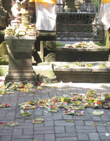 商売の神様へのお供え物。バリ島では、至る所にこういうお花でできたお供え物が